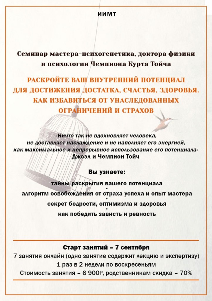 • 21.09.2025 12:00 — 15:00 (МСК) — онлайн в ИИМТ, изучение записи семинара Ч.К.Тойча с переводом на рус. язык — лекция + консультативный сеанс + ответы на вопросы из аудитории, часть 2, стоимость — 6 900 р., оплата в ИИМТ